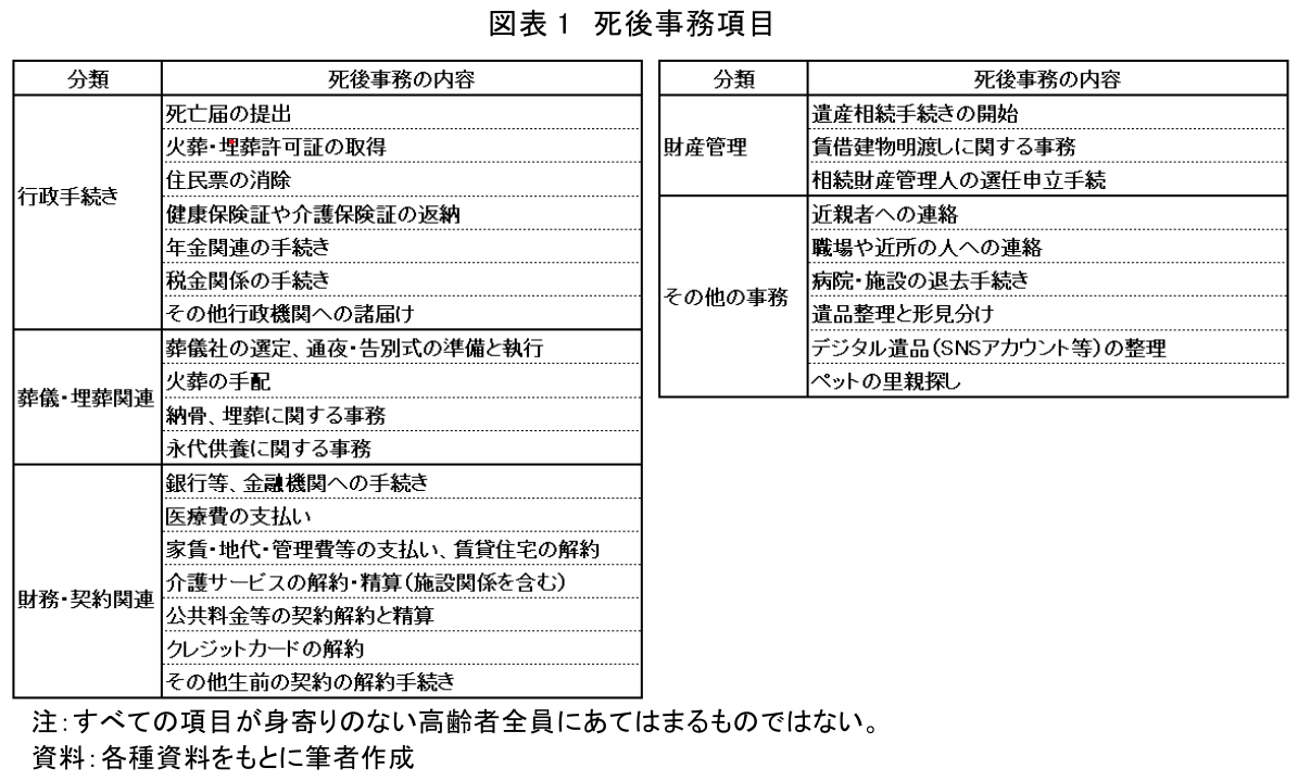 親の死後事務を経験した人であれば知っていると思うが、図表1の通り、死後事務には多種多様な項目があり、しかも一定期間内に処理しなければならないものも多い。さらに、行政手続きをはじめ、大半がオンラインで処理ができず、事務所などに足を運ぶ、あるいは郵送の手配をするなど、多大な時間と手間をかけなければならない。家族・親族がいる場合であっても、一切の準備をせずに任せることには躊躇してしまうほどである。まして、身寄りがない高齢者にとっては、悩みの種となるだろう。