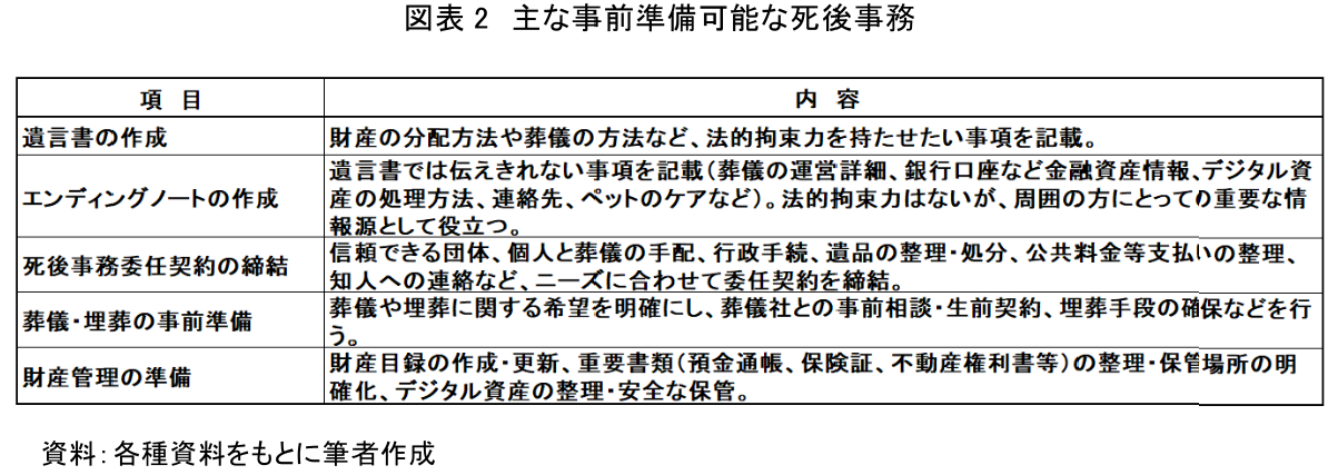 自分の死後の事務手続き・処理についての不安を軽減するために、生前に準備できる項目は多くある(図表2)。こうした準備を行うことで、死後の手続き・処理の大半がスムーズに進み、周囲にかかる負担を和らげることが可能となる。