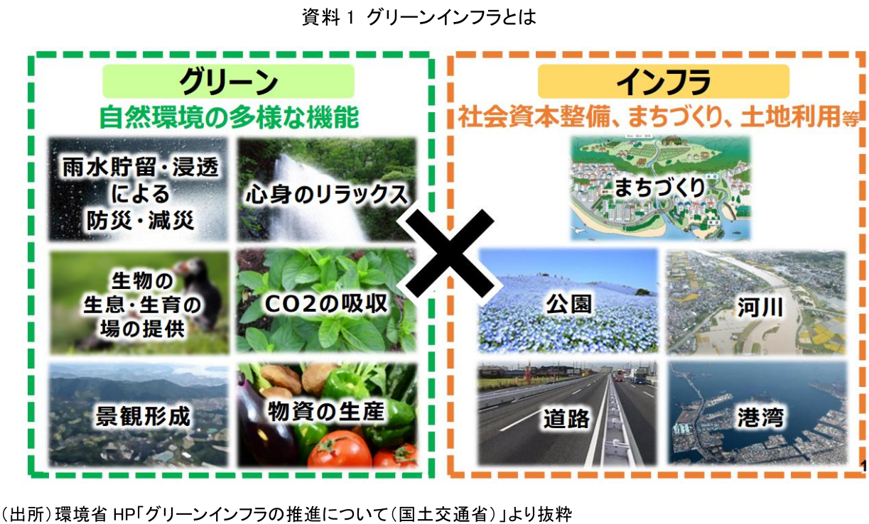 「グリーン」は、単に緑や植物といったことを意味するのではなく、自然環境が持つ自律的回復力をはじめとする多様な機能を積極的に活かすという意味を持ちます。「インフラ」は、従来のダムや道路等のハードとしての人工構造物だけを意味するものではなく、自然環境との共生に適した社会資本整備やまちづくり、土地利用等を含み、地域社会の活動を下支えするソフトの取組も含まれます(資料1)。