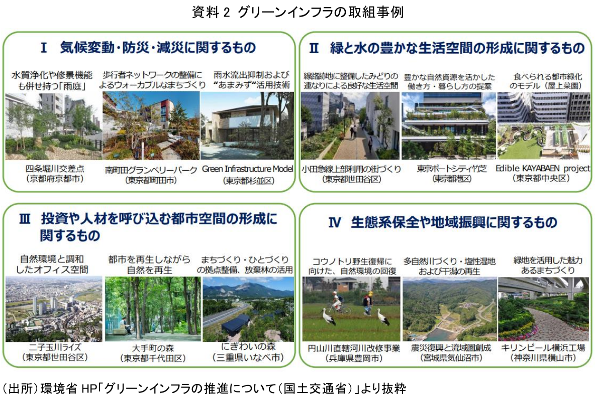 具体的には、防災・減災の対策や、心身のリラックス、CO2の吸収促進、生態系保全、景観や生活空間の形成、投資や人材を呼び込む都市空間の形成、地域振興などに活用されています。また、2023年より国土交通省による「グリーンインフラ推進戦略2023」が始まり、実装に向けた取組が全国で進められています(資料2)。