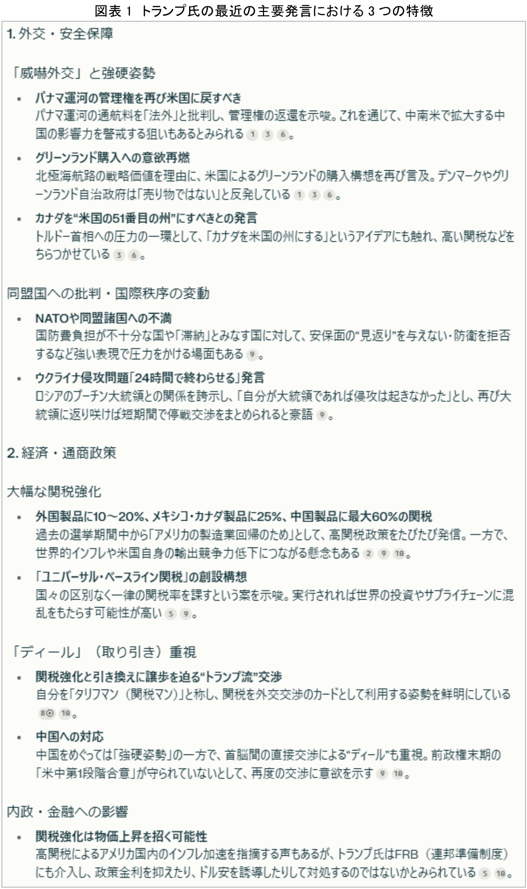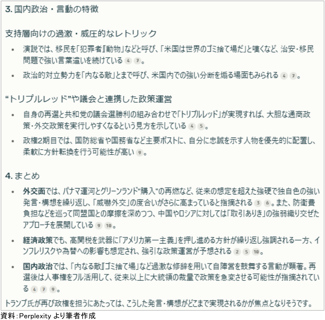 まず、AIに「トランプ氏の最近の政治、経済、外交に関する発言をまとめてください」という指示を与えたところ、以下のような分析結果が得られた。