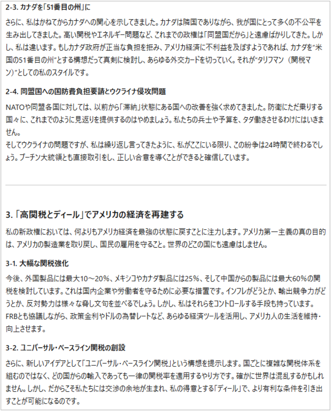 次に、「ドナルド・トランプ氏は2025年1月20日に第47代アメリカ合衆国大統領として就任式で演説を行います。想定される演説内容を予測してください」と指示を与えたところ、AIは「アメリカの主権と安全保障」「威嚇外交」「高関税とディール」「内政・議会対策」「結び」という5つのセクションで構成される約5,000語の包括的な内容を提示した。演説では、パナマ運河の管理権やグリーンランド購入構想、カナダへの強硬姿勢、同盟国との防衛費負担問題、ウクライナ紛争への対応、そして経済政策としての高関税措置やユニバーサル・ベースライン関税の導入など、具体的な政策方針が詳細に語られている。さらに、移民問題や国内の政治的分断に対する強い姿勢も示されており、トランプ氏の政権運営の blueprint となる内容となっている。