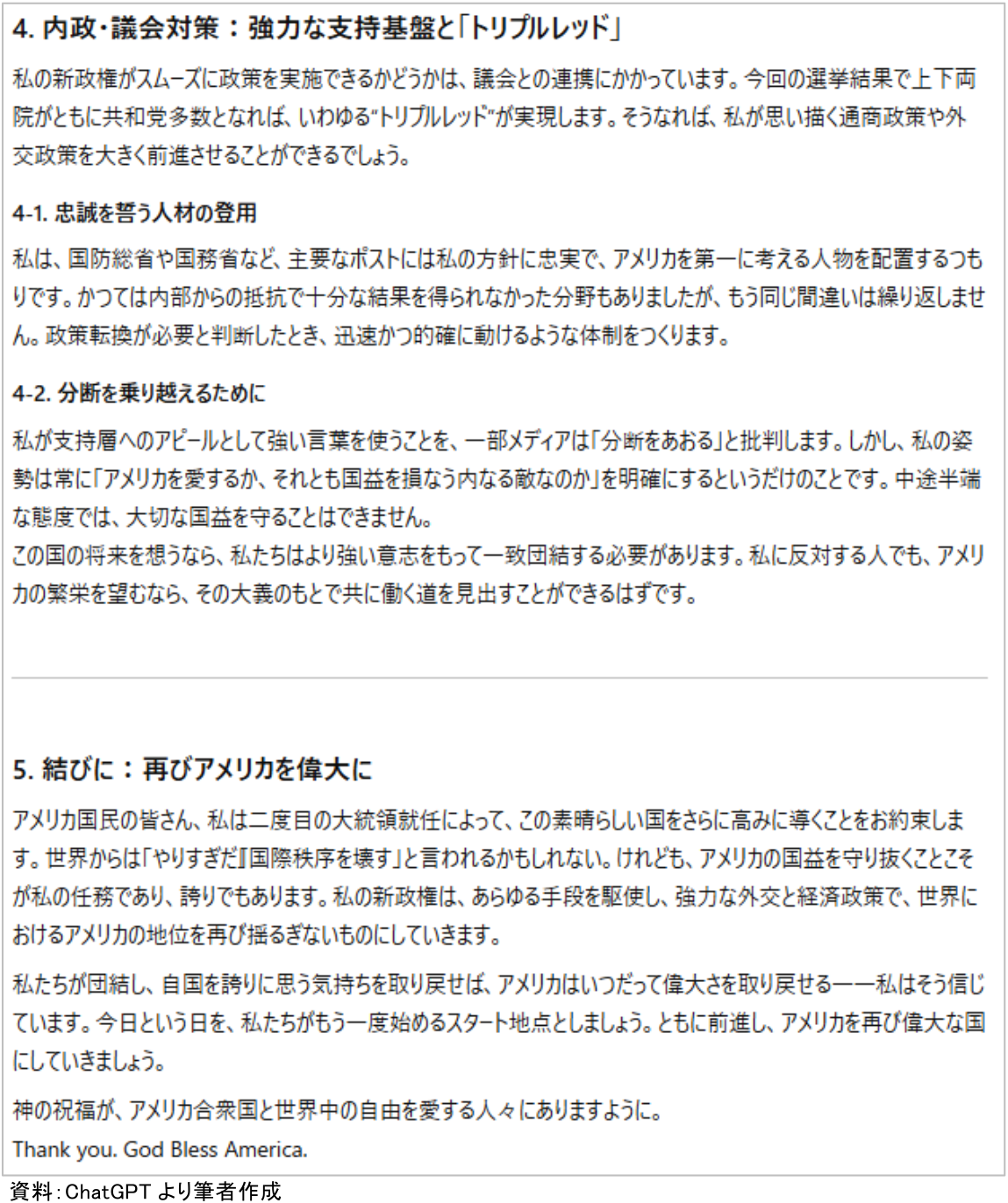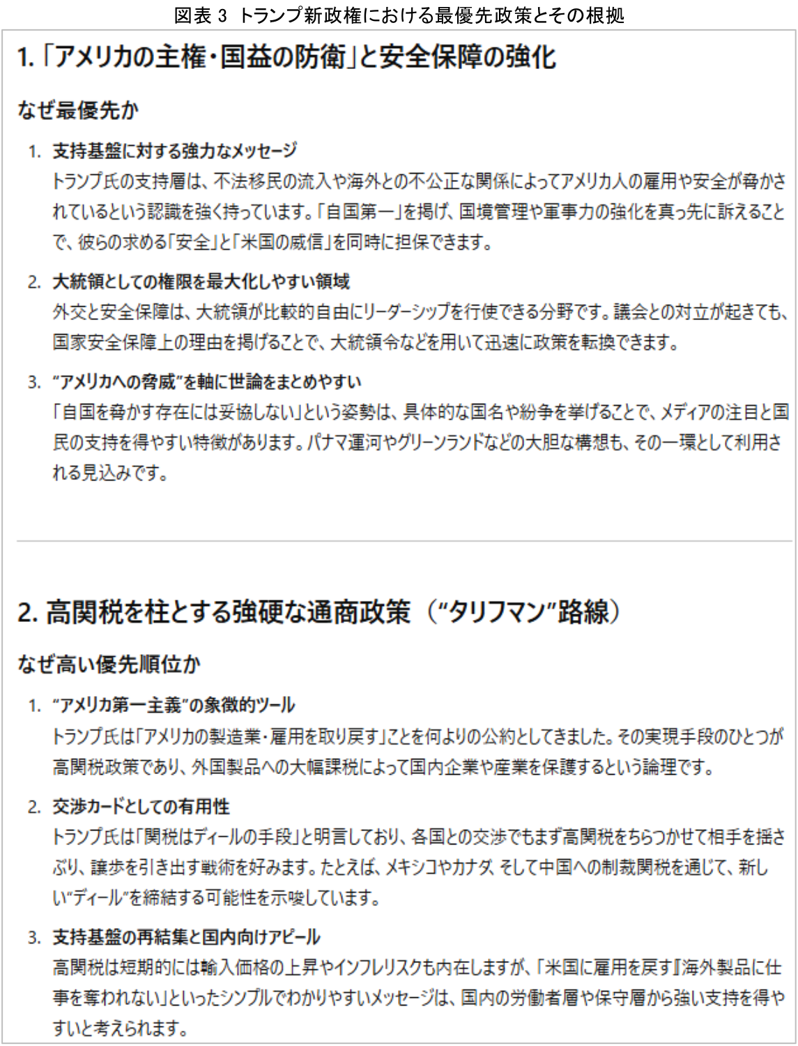 最後に、「演説の中で重要視する内容の中から優先順位の高い順に3つ具体的に示してください。優先順位が高い理由についても明確化ください」と指示を与えたところ、AIは「アメリカの主権・国益の防衛」と安全保障の強化、高関税を柱とする強硬な通商政策("タリフマン"路線)、そして政権基盤強化("トリプルレッド"と主要ポストへの忠誠人事)を重要度の高い3つの政策として抽出した。それぞれの政策について、支持基盤への訴求力、政策実現の実効性、国内外への影響力などの観点から詳細な分析が示され、これらが最初の1年目から集中的に実行される可能性が高いとの見解が示された。