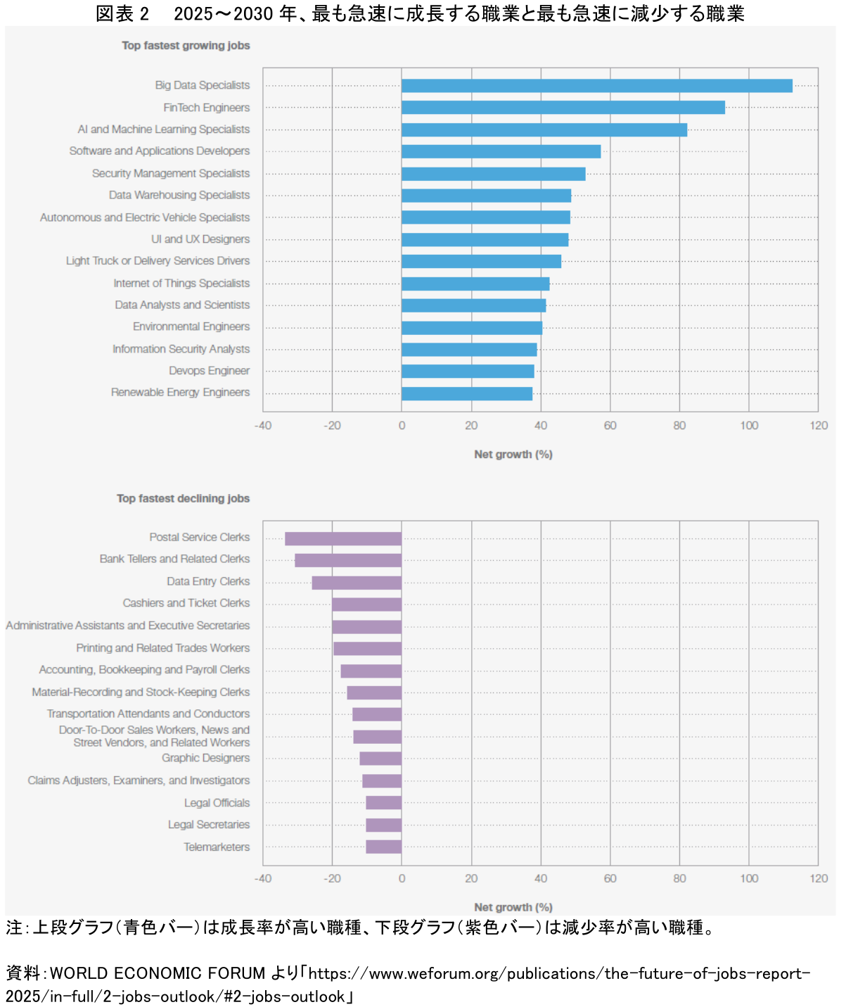 注目すべきは、業種や職種による明確な二極化である。成長率が最も高い職種としては、ビッグデータ専門家(約120%の成長率)を筆頭に、フィンテック技術者、AI・機械学習スペシャリスト、ロボット工学エンジニア、ソフトウェア開発者などのデジタルテクノロジー関連職種が上位を占めている(図表2)。また、自動運転・電気自動車スペシャリストや再生可能エネルギーエンジニアなど、グリーントランジションに関連する職種も大きな成長が見込まれている。これらの職種の台頭は、企業のデジタルトランスフォーメーションの加速や持続可能性への取り組み強化を反映している。