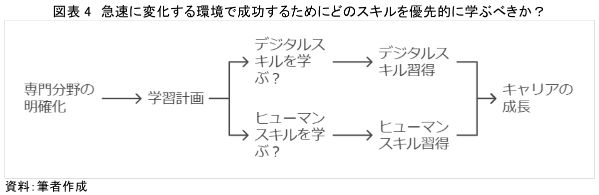 図表4に「急速に変化する環境で成功するためにどのスキルを優先的に学ぶべきか」を示したが、自分の目標や関心に照らし合わせながら、学習への投資や関連するコミュニティとの連携、成果の検証方法などを自ら設計することで、将来への不安は減少し、自分らしいキャリアの羅針盤を手にすることができるであろう。また、テクノロジーの進化によって、これまで安定しているとされた職種が消滅し、グリーントランジションやデジタルトランスフォーメーションの専門家が急速に台頭する姿は既に現実のものとなりつつある。これを脅威ではなくチャンスとして捉えるためにも、日々のリスキリングやアップスキリングを怠らず、ヒューマンスキルも併せて強化することが重要である。加えて、自分が磨いたスキルが「どのような課題を解決し、どのような人々を支えるか」を意識することで、キャリアは単なる仕事ではなく、自らの価値観や社会への貢献を形にするステージへと変わっていく。
