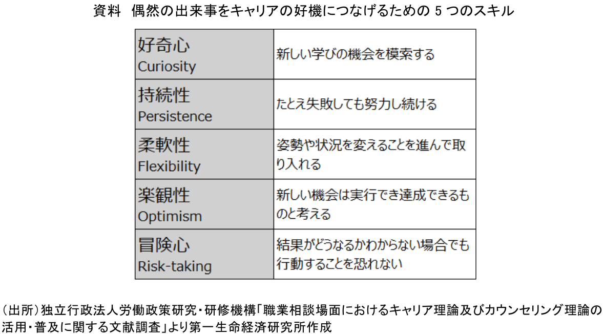 キャリアは必ずしも安定したものではなく、変化し続けるものです。「偶然の出来事」を引き寄せ、キャリアの好機につなげるためのスキル(資料)を磨いていくことが、VUCAの時代に生きる新しいキャリア力となるでしょう。