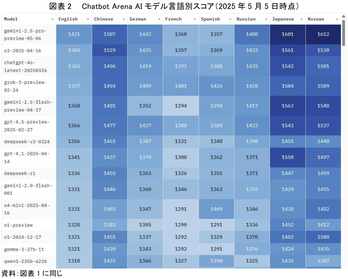 総合的な性能評価に続き、LMSYS Chatbot Arenaが提供するもう一つの重要な視点は、特定の言語環境におけるAIのパフォーマンスに焦点を絞った、言語別のスコアである(図表2)。このカテゴリーでは、英語、中国語、ドイツ語、フランス語、スペイン語、ロシア語、日本語、そして韓国語といった、世界の主要な言語それぞれにおいて、AIの対話応答の品質、すなわちその言語を母語とする人間にとっての自然さや的確さが詳細なスコアとして評価されている。