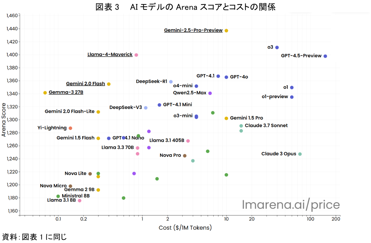 さらに、LMSYS Chatbot Arenaのウェブサイトでは、純粋な性能評価に加えて、経済的な観点からの考察を深めるための貴重な関連情報も提供されている。その一つが、AIモデルのArenaスコア、すなわちその中核的な「性能」と、そのAIを利用する際に発生する「コスト」(通常、入力および出力されるテキストの量、すなわちトークン数あたりで計算される価格)との関係性を視覚的に示した散布図である(図表3)。