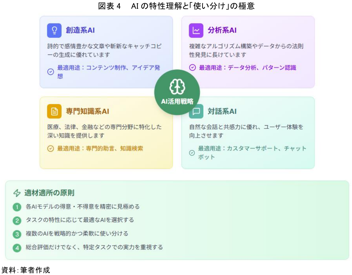 ここで最も肝要なのは、それぞれのAIモデルがもつ固有の特性、すなわち、最も得意とする処理領域やタスク、逆に能力の限界を露呈しやすい不得意な分野を精密に見極め、複数のAIを戦略的に、かつ柔軟に適材適所で使い分けるという高度な運用思想をもつことである。