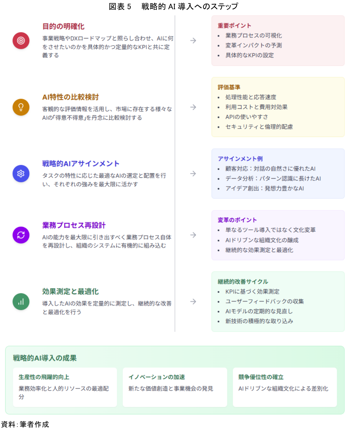 たとえば、顧客対応チャットボットには対話の自然さと共感力に優れたAIを、データ分析には複雑なパターン認識能力と高速処理に長けたAIを、新規事業のアイデア創出には発想の意外性と多様な知識をもつAIを、といった具合に、タスクの特性に応じた「AIアサインメント」を戦略的に行う。そして、選定したAIを、単に既存のワークフローにアドオンするのではなく、AIの能力を最大限に引き出すべく業務プロセス自体を再設計(BPR)し、組織のシステムに深く、かつ有機的に組み込んでいくという、能動的かつ知的な変革のリーダーシップが不可欠となる。それは、単なるツールの導入ではなく、「AIドリブンな組織文化」へのトランスフォーメーションに他ならない(図表5)。