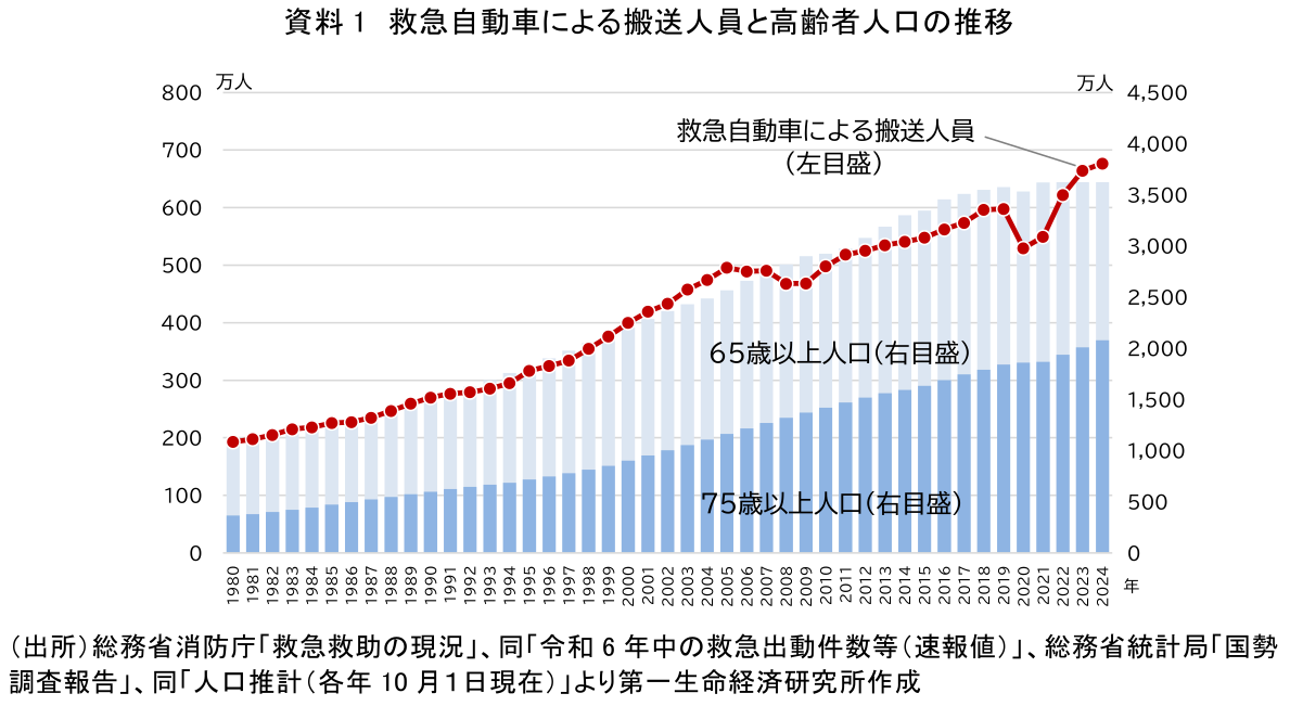 本稿では、わが国の高齢化の進展と救急需要の見通しについて考察する。総務省消防庁「令和6年中の救急出動件数等(速報値)」によると、2024年の救急自動車による救急出動件数は771.7万件、搬送人員は676.5万人で、1963年(出動件数23.9万件、搬送人員21.6万人)の集計開始以来、いずれも過去最多を更新した。日本の総人口に対する搬送人員の割合でみると、1963年には約445人に1人だったものが、2024年には約18人に1人へと、およそ27倍に激増している。