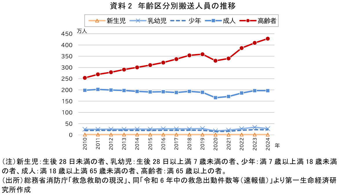 2024年の救急自動車による搬送人員を年齢区分別にみると、65歳以上の高齢者が428.2万人、成人が196.8万人、乳幼児が27.5万人などである。資料2において、その推移をみると、高齢者が過去最多を更新する一方、新生児から成人までは、ほぼ横ばいとなっている。搬送人員全体に占める割合も、高齢者が増加傾向にあり、2010年の約51%から2024年には約63%(+12%ポイント)となる一方、特に成人は2010年の約40%から2024年には約29%(▲11%ポイント)に減少した。こうした状況から、搬送人員の増加は、主に高齢者の搬送人員の増加に伴うものであることがうかがえる。