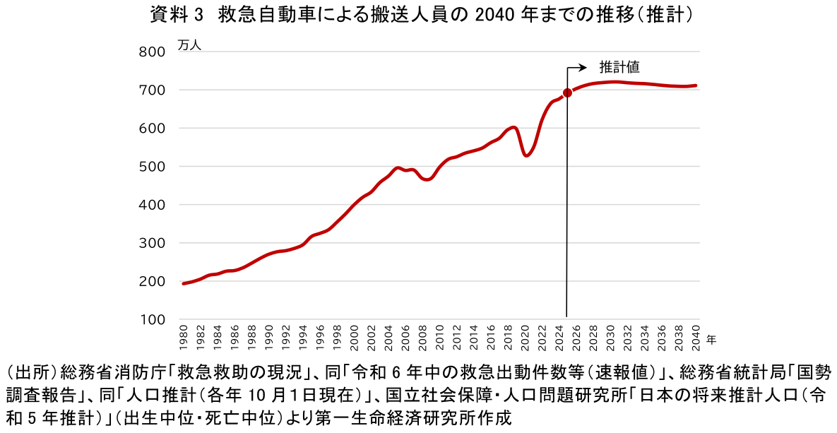 資料3は、粗い試算ながら、相関の高かった75歳以上の将来推計人口を回帰式に投入して、2025年から高齢者人口がほぼピークを迎える2040年までの搬送人員を推計したものである。推計によると、搬送人員は今後も増加し2030年前後には約720万人(対2024年速報値+44万人)とピークを迎える。その後も2040年にかけて約710万人前後と高水準が続くと見込まれる。
