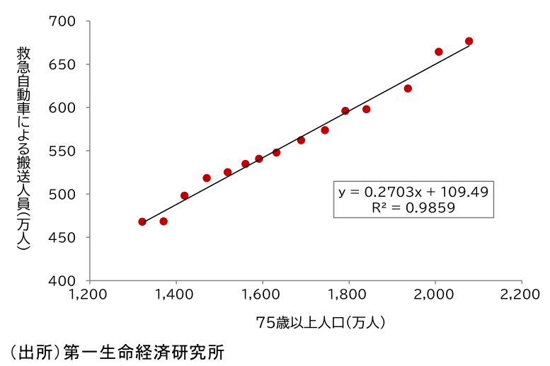 そこで、今後の救急需要について、救急自動車による搬送人員と高齢者人口との関連に基づいて考察する。その際、高齢者人口については、75歳以上人口に焦点を当てることとした。総務省消防庁「令和6年版救急救助の現況」によると、高齢者の搬送人員の中でも65歳~74歳が減少傾向にある一方、75歳~84歳および85歳以上は増加傾向にあるためだ(注2)。次に、日本が高齢社会に突入し、総人口がピークに達した2008年から最新データの2024年において、搬送人員と75歳以上人口の関連について回帰分析を試みた。その結果、両者の相関は高く、回帰式の当てはまりの良さを示す決定係数(R2)は0.9859となった(注3)。なお、65歳以上人口で同様に回帰分析したところ、決定係数(R2)は0.8545で、75歳以上人口よりも相関が低かったことを付言しておく。