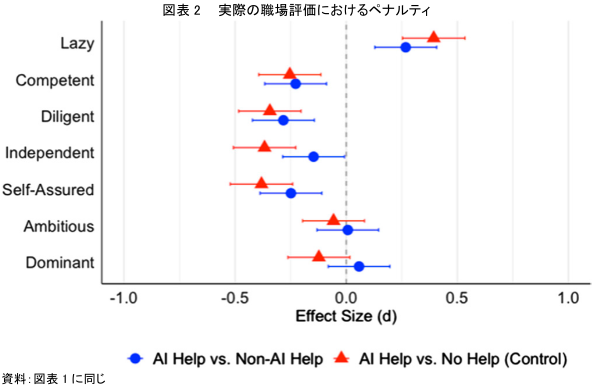 その結果、AI利用者は、他のグループと比較して、実際に「怠け者(Lazy)」であるとより強く評価される傾向が見られた(図2 右上の青丸と赤三角参照)。さらに、「有能(Competent)」「勤勉(Diligent)」「自立(Independent)」「自信(Self-Assured)」といった、業務遂行能力や主体性を示す重要な特性においても、一貫して低い評価を受けるという事実が確認された(図2 左側の青丸と赤三角参照)。一方で、「野心的(Ambitious)」や「支配的(Dominant)」といった対人関係に関わる特性評価には、統計的に有意な差は見られなかった。