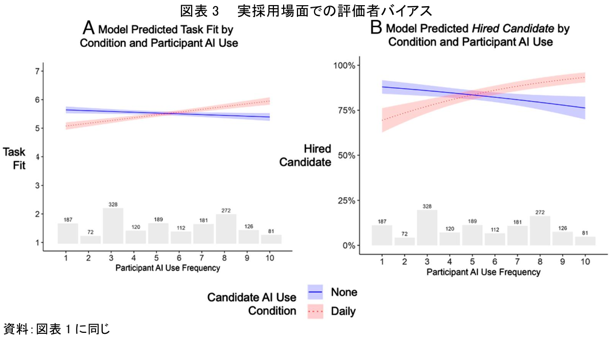 ここで極めて示唆深いのは、評価者自身のAI利用頻度(グラフ横軸:Participant AI Use Frequency)が、候補者評価の方向性に大きな影響を与えている点である。具体的には、評価者自身がAIをあまり使わない場合(横軸左側)、AIを日常的に使う候補者(赤点線)よりも、AIを全く使わない候補者(青実線)のタスク適合性を高く評価し、採用する確率も高かった。しかし、評価者自身のAI利用頻度が高まるにつれて(横軸右側)、この評価は完全に逆転し、AIを日常的に使う候補者(赤点線)をより高く評価し、採用する確率が高まる傾向がある。