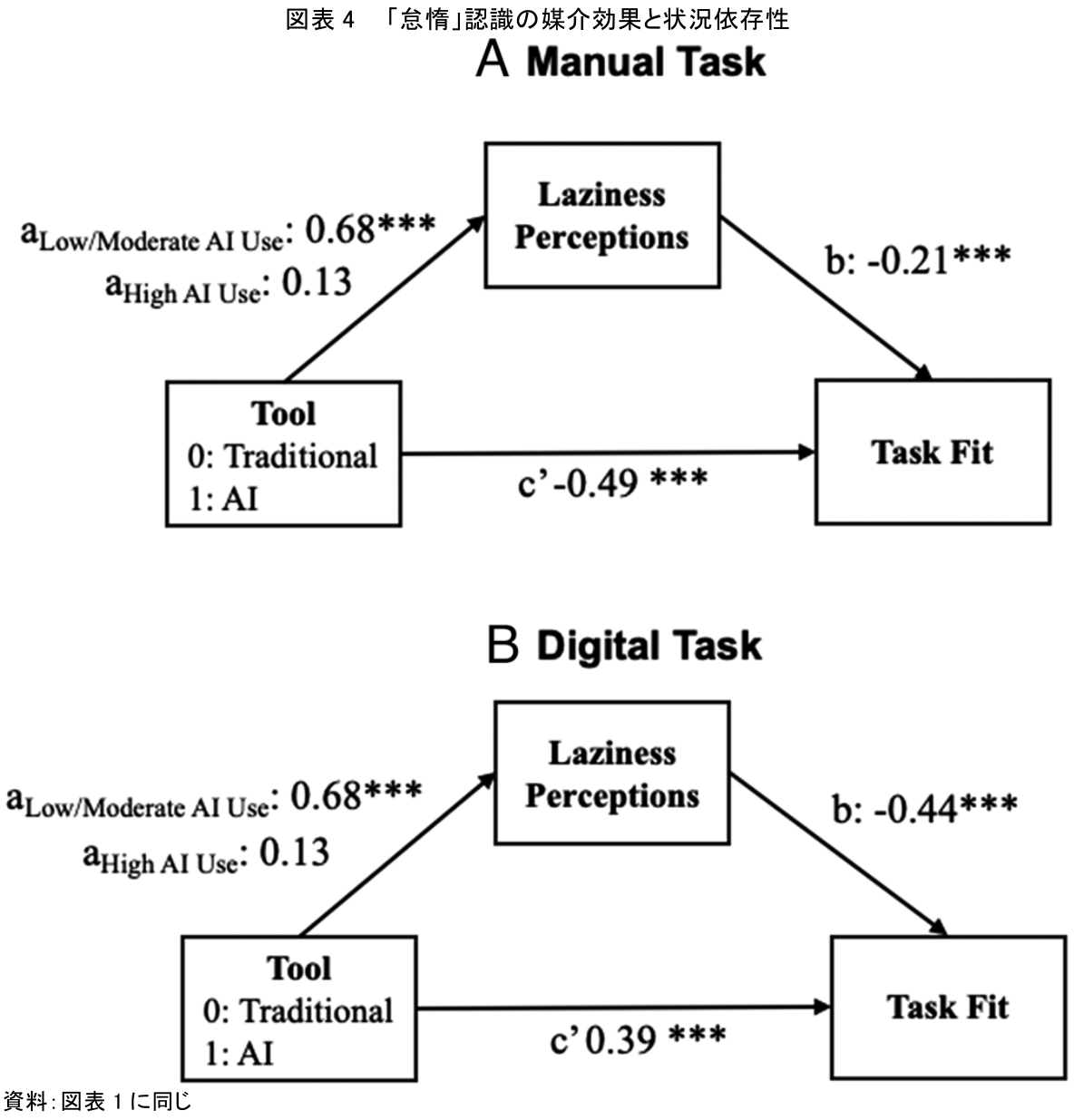 分析の結果、「AIを使っている人は怠け者である(Laziness Perceptions)」という周囲の認識(一種のステレオタイプやバイアス)が、AI利用(Tool 1: AI)という事実と、「仕事への適性が低い(Task Fit)」という最終的な評価判断との間をつなぐ、強力な媒介要因となっていることが突き止められた(図4 a→bの経路)。つまり、「AI活用=楽をしている=怠惰」という短絡的な連想が、本人の能力や仕事への適性そのものに対する否定的な判断を引き起こしているのである。