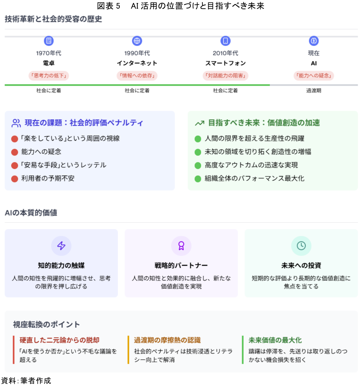 たとえば過去、電卓が「思考力の低下」を、インターネットが「情報への依存」を、スマートフォンが「対話能力の阻害」を招くのではと懸念されたように、革新的技術は常に、既存の価値観との軋轢の中で「人間の従来の能力低下への疑念」や「安易な手段の採用」というレッテルと戦ってきた。だが、それらの技術が今日、我々の知的生産活動に不可欠な基盤となっている事実は、我々が進むべき道を示唆しているのではないか。