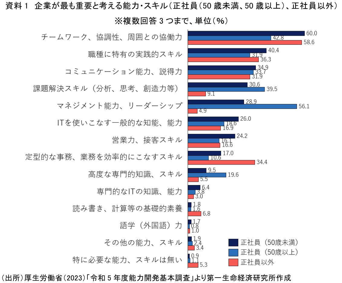 前段の某社が、欲しい人材として「チームプレーヤー」を挙げているように、日本でも多くの企業が「最も重要と考える能力・スキル」に「チームワーク、協調性、周囲との協働力」といったチームプレーヤーとしての能力を挙げている(資料1)。