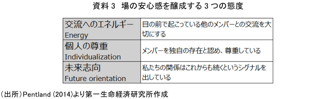 このような「美味しいリンゴ」の行動、いわゆる場の安心感を醸成する態度には「交流へのエネルギー」「個人の尊重」「未来志向」といった3つの特徴があることがわかっている(Pentland,2014)(資料3)。