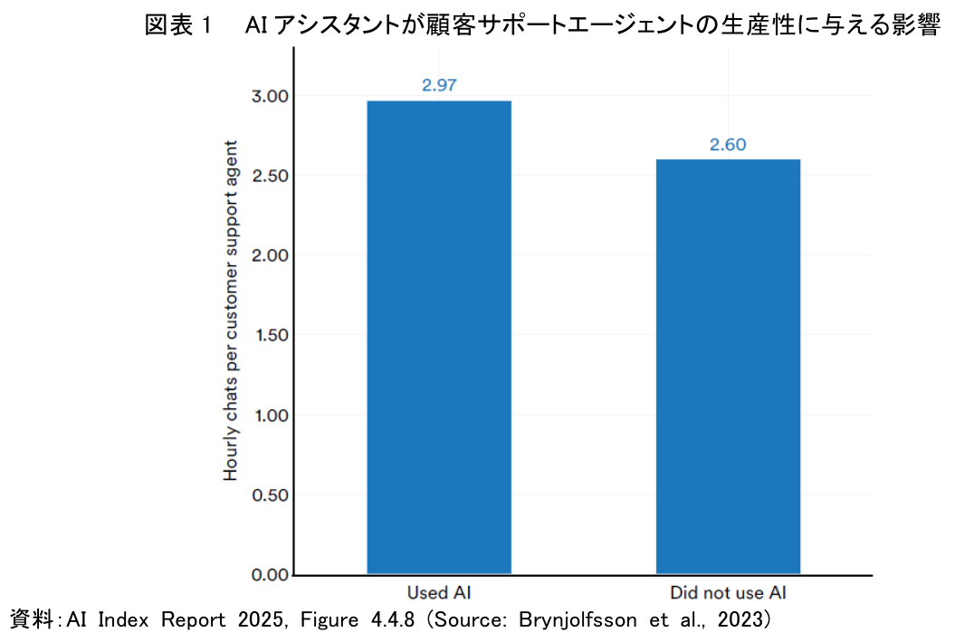 まず注目すべきは、AIがもはや単なる期待の対象ではなく、実際に効果を測定できる生産性向上ツールになっている点である。「AI Index Report 2025」では、その代表例として顧客サポート業務における生成AIアシスタントの導入効果を分析した研究を挙げている(図表1)。この研究によれば、AIアシスタントを利用したエージェントは、利用しなかったエージェントと比較して、1時間あたりに解決する課題数が平均14.2%向上した。これは、AIが人間の能力を補完・拡張し、具体的な業務効率の改善に直結する有力な証拠である。さらに、専門性の高い知的労働においても、AIの活用が新素材発見率を44.1%向上させるなど、その効果が発揮されている。この事実は、AIが単なるコスト削減ツールに留まらず、企業のイノベーション創出能力そのものを高めるエンジンとなりうることを示唆している。この生産性革命の波に乗り遅れることは計り知れない機会損失に他ならない。