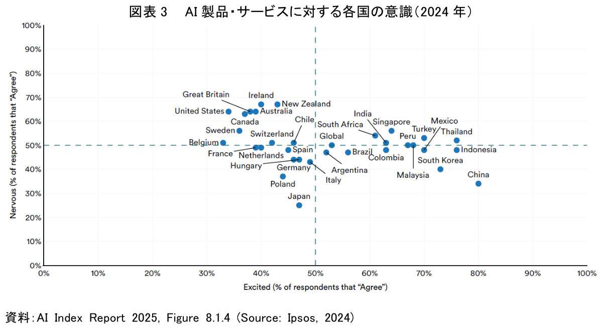 技術や投資に加え、AI導入の成否を左右するのが、社会全体の受容性、すなわち国民感情である。「AI Index Report 2025」は、AIに対する各国の意識調査の結果も示しており、そこから日本特有の課題が浮かび上がってくる(図表3)。中国やインドネシアなどが「高い興奮・低い不安」の領域に位置し、AIに極めて肯定的な姿勢を示すのとは対照的に、日本は「低い興奮・低い不安」の領域にプロットされている。これは、日本社会全体で、AIがもたらす便益への期待と同時にリスクへの懸念も共に低い水準にあり、AIに対して様子見、あるいは無関心な層が多いことを示唆している。この国民感情は、企業の大胆なAI導入を妨げる「見えざる壁」となりかねない。経営者は技術導入と並行し、AIの利点や安全性について丁寧に説明し、社会的なコンセンサスを形成していく努力が不可欠である。