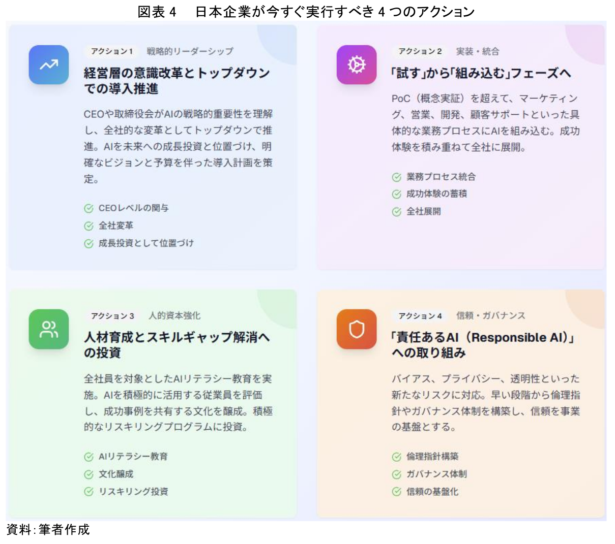 この危機的状況を乗り越え、AI時代における新たな成長を掴むために、日本企業は以下の4つの行動を直ちに開始すべきである。