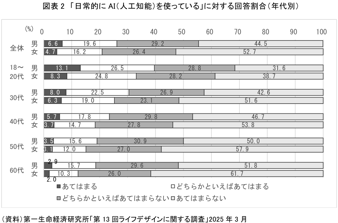 当研究所が行った調査でも、「日常的にAI(人工知能)を使っている」に対して、あてはまる」と「どちらかといえばあてはまる」を回答した合計割合は、男性で26.2%、女性で20.9%であった(図表2)。こうした男女差は年代を問わず生じている。