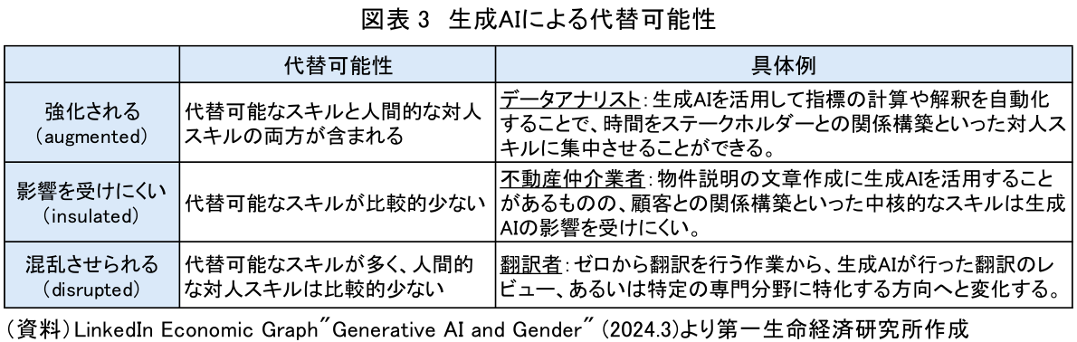 さらに、LinkedInのレポート「Generative AI and Gender」(2024年)は、生成AIの各職業に与える影響を3つに分類した(図表3)。基本的に、「強化される」「影響を受けにくい」が生成AIによって代替される可能性が低い職業で、「混乱させられる」は代替される可能性が高い、あるいはより専門性を高めるなど職業スキルの強化が特に必要な職業と解釈できる。