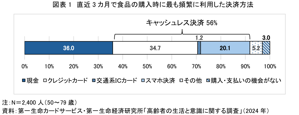 まず、50歳以上のシニア層におけるキャッシュレス決済の普及状況をみる。直近3カ月で食品の購入時に最も頻繁に利用した決済方法は、現金(36%)であった(図表1)。一方、クレジットカードも34.7%と同程度であり、交通系ICカードとスマホ決済を合わせたキャッシュレス決済は56%に達している。一般的に、決済金額が高い場合にクレジットカードをはじめとするキャッシュレス決済が利用される傾向があるが(注3)、食品のような日常的な買い物においても、半数以上が主な決済方法として利用しており、キャッシュレス化が日常生活にも普及していることがうかがえる。