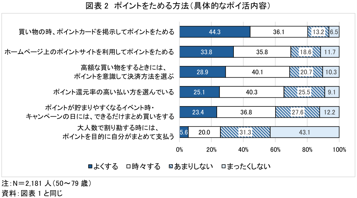 次に、ポイ活について、具体的にどのような方法でポイントを貯めているかをみる(図表2)。「よくする」との回答が最も多かったのは、「買い物の時、ポイントカードを提示してポイントをためる」(44.3%)であり、次いで「ホームページ上のポイントサイトを利用してポイントをためる」(33.8%)であった。
