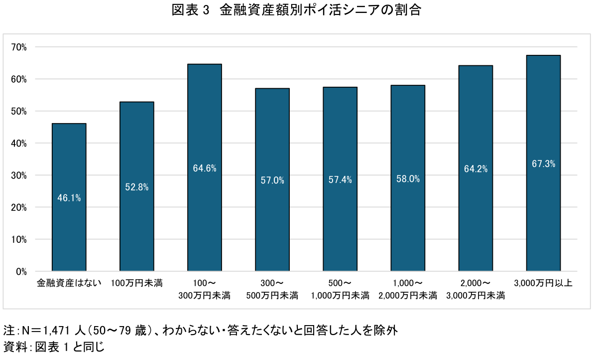 次に、金融資産額をみると、資産額が大きいほど、ポイ活シニアの割合も高まる傾向にあるが、100~300万円未満の人でもその割合は高い(図表3)。ただ、資産額にかかわらず、約5割以上の人がポイ活を実践している。多くの人に少しでも節約したいという意向があり、その手段としてポイ活が利用されているのだろう。