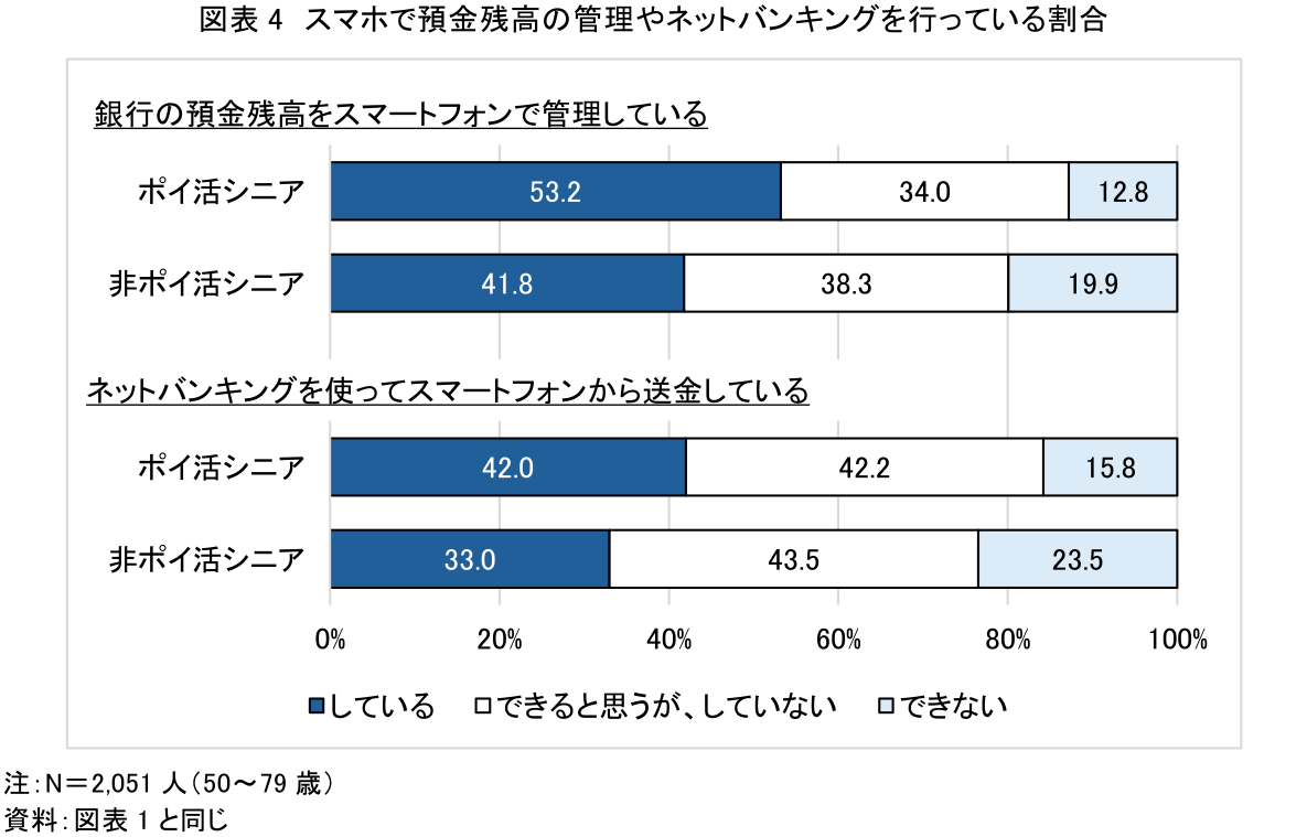 さらに、ポイ活シニアは、スマートフォンで銀行の預金残高の管理やネットバンキングを行っている割合も高かった(図表4)。これらの行動には、金融リテラシーとデジタルリテラシーの両方が求められ、こうしたスキルがポイ活にもつながっていると考えられる(注5)。
