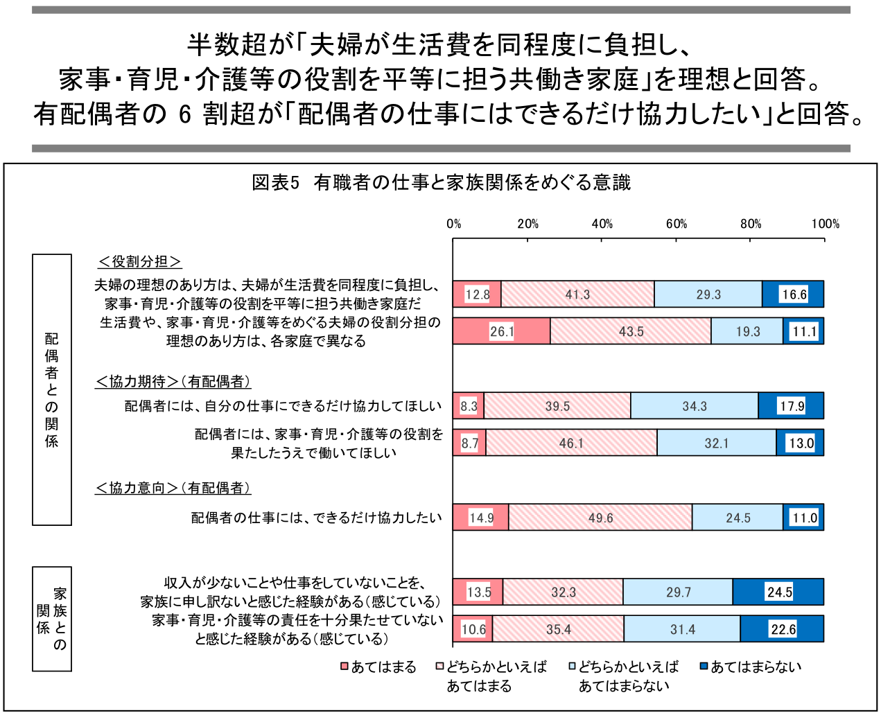 図表5は、有職者の仕事と家族関係についての意識です。「夫婦の理想のあり方は、夫婦が生活費を同程度に負担し、家事・育児・介護等の役割を平等に担う共働き家庭だ」「生活費や、家事・育児・介護等をめぐる夫婦の役割分担の理想のあり方は、各家庭で異なる」に「あてはまる」「どちらかといえばあてはまる」と回答した合計割合が、それぞれ54.1%、69.6%となっています。生活費や家庭役割等を全て対等に担う関係を理想とする人が半数超を占めますが、理想像は多様と考える人の方が上回りました。