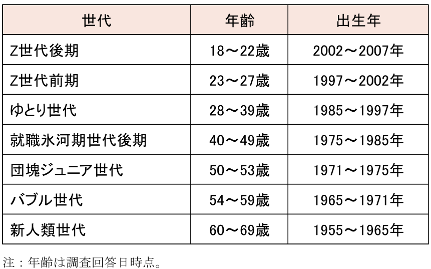 本調査では、世代を年齢に基づいて定義しました。詳細は下記の通りです。