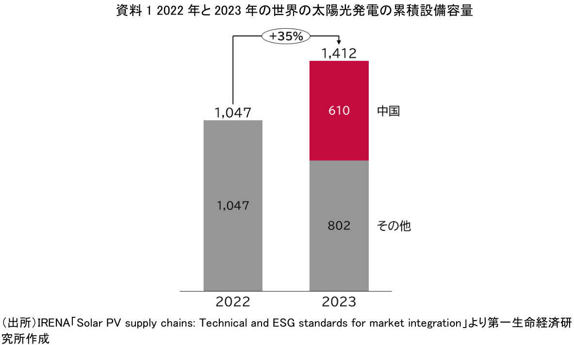 世界的な脱炭素の潮流のなか、太陽光発電は再生可能エネルギーの主力として急速に普及している。しかし、そのサプライチェーンは特定の国、とりわけ中国に大きく依存している。IRENA(国際再生可能エネルギー機関)の報告書「Solar PV supply chains: Technical and ESG standards for market integration」によると、世界の太陽光発電の累積設備容量(全ての発電設備の最大合計出力)は2022年の1,047GWから2023年時点で1,412GWに増加し、そのうち中国の累積設備容量は約610GWと4割強を占める(資料1)。中国国家エネルギー局によると、2024年時点の累積設備容量は887GWに達し、前年から約1.45倍へとさらに大きく成長した。