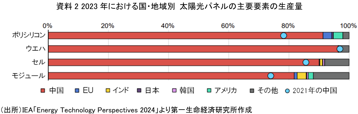 サプライチェーンの中国依存度はさらに高い。IEA(国際エネルギー機関)のレポート「Energy Technology Perspectives 2024」によれば、現在、太陽光パネルの原材料のポリシリコンから、シリコンを薄く切り出したウエハ、電気を生み出す発電素子となるセル、それらを組み合わせたモジュールという川上から川下までの製造工程のすべてにおいて、中国が世界シェアの80%以上を占める(資料2)。