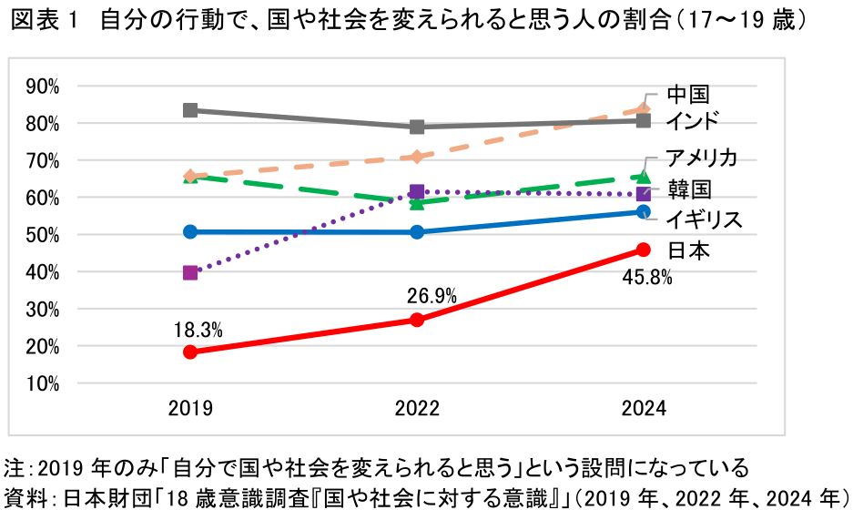 日本の若者は、社会の形成に主体的に参画する意識が低いことが指摘されてきた。図表1は、日本財団が17~19歳を対象に実施した調査結果である。「自分の行動で、国や社会を変えられると思う」という設問に「同意」または「どちらかといえば同意」と回答した割合は、2024年の日本では45.8%であった。確かに他国と比較して低い水準ではあるが、2022年の26.9%からは改善の兆しがみられている。