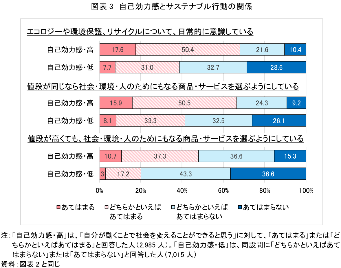 このように、サステナブル行動と自己効力感は相性がよい。成果が即座に反映しにくい行動を継続するには、自らの行動の意義を信じ、それを実行できるという自信を持つことが不可欠である。したがって、社会変革に対する自己効力感の高さは、サステナブル行動を支える根本的な心理的要因といえる。
