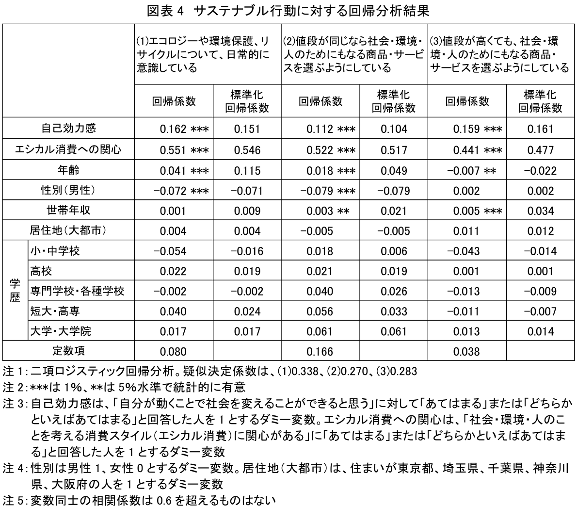 図表4は、上述の3つのサステナブル行動それぞれを目的変数においた、回帰分析の結果である。目的変数は、それぞれ「あてはまる」または「どちらかといえばあてはまる」に回答した人を1とするダミー変数である。また、「*」マークが付いている変数が統計的に有意、すなわち結果に影響を与えている属性となる。たとえば、一番左(1)の結果をみると、「自己効力感」の回帰係数は0.162***となっている。これは、社会変革に対する自己効力感が高い人ほど、「エコロジーや環境保護、リサイクルについて、日常的に意識している」可能性が高いという結果になる。一方、世帯年収は有意ではないため、今回の分析からは世帯年収の高さの影響はみられなかったといえる。