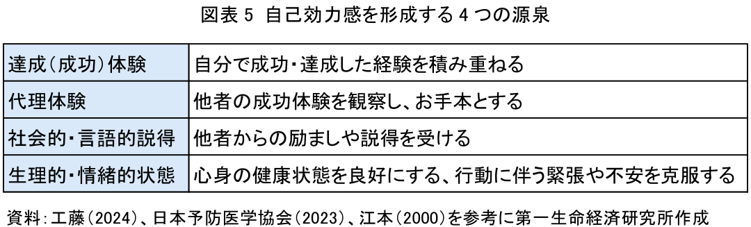 では、社会変革に対する自己効力感は、どのように高めればよいのだろうか。バンデューラは、自己効力感の形成には4つの源泉があるとしている(図表5)。