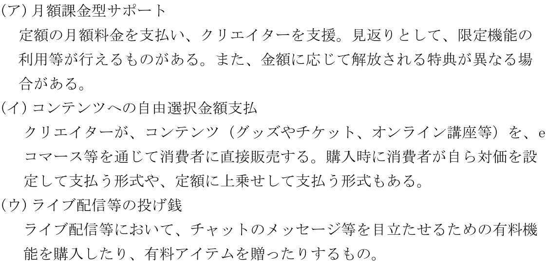 特定非営利活動法人日本ファンドレイジング協会では、クリエイターエコノミー関連サービスとしての以下の3つの消費行動については、倫理性は伴わないものの、他者のための社会的消費(注1)であるとしている。
