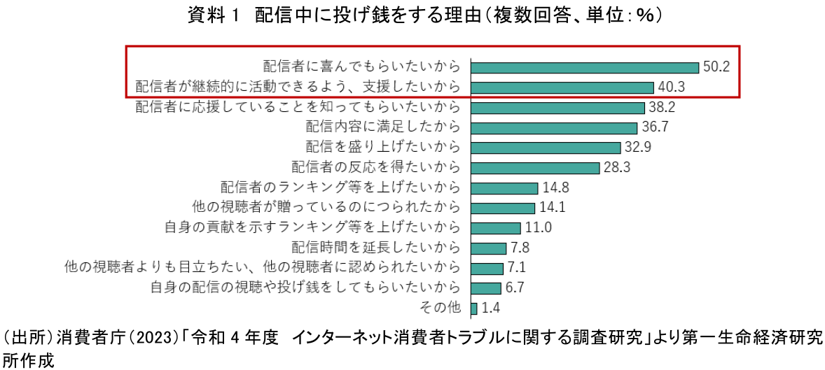 消費者庁が2022年度に実施したインターネット消費者トラブルに関する調査研究においてクリエイターエコノミー関連サービスについても調査されている(資料1)。この調査のなかで、配信中に投げ銭をする理由として一番多かった回答が「配信者に喜んでもらいたいから」、次点で「配信者が継続的に活動できるよう支援したいから」となっており、「配信者(他者)」を支援したい欲求からくる消費行動だということがうかがえる結果となっている。