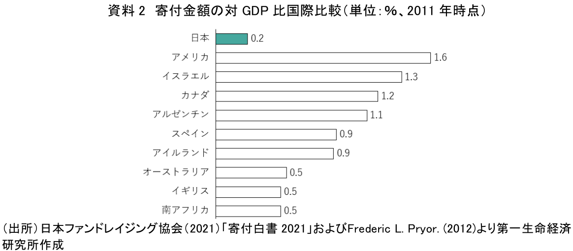 日本の寄付金額の対GDP比は、米・英などの先進国はもとより、新興国と比べても格段に小さい(資料2)。これには宗教的な背景(寄付を義務づけるような教え)や、日本は社会保障制度が比較的充実しており、困窮者は国や自治体がある程度助けるべきという考えがあること、税制上のメリットが少ないことなど、様々な要素が複合的に影響していると考えられる。