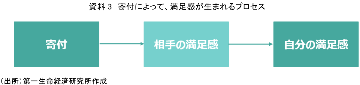 この寄付をしたことによる満足感のなかで最も代表的な満足感として知られているのが「利他性」からくる満足感だ。相手が喜んだり、相手の状態が良くなったりと、相手の満足感が高まると自分自身も満足感を感じるというプロセスである(資料3)。