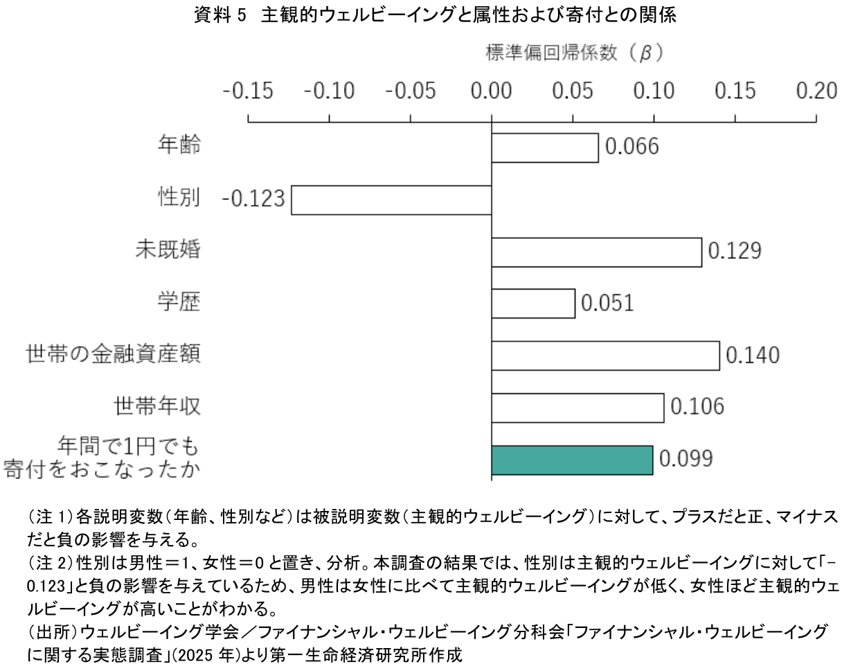 資料5は、主観的ウェルビーイングを被説明変数とし、年間で1円でも寄付をおこなったかどうか、および主観的ウェルビーイングに影響を与え得る年齢、性別、未既婚、学歴、世帯年収等の属性を説明変数とし、重回帰分析を実施した場合の標準偏回帰係数(β)を示している。各説明変数の標準偏回帰係数を計算することで、元の説明変数の基準を揃えて、被説明変数に対する説明変数の影響度の大きさを比較できる。今回の調査から、年間で1円でも寄付をすること(β=0.099)が、主観的ウェルビーイングに世帯年収(β=0.106)と同程度の影響を与えていることがわかった。