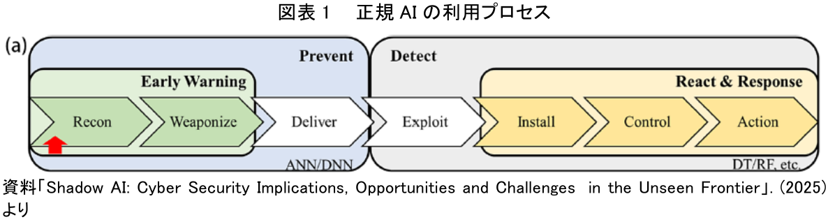 組織におけるAI活用の理想形は、サイバー攻撃の全フェーズにおいて厳格なガバナンスが機能するプロセスに則っていることである。図表1は、この理想的な状態を示している。この図は、サイバー攻撃が「Recon(偵察)」から「Action(行動)」に至る一連の流れ(サイバーキルチェーン)を模している。正規プロセスでは、攻撃の初期段階である「Prevent(予防)」フェーズから組織が主体的に関与し、脅威を監視していることがわかる。これは、組織が脅威を未然に防ぐための管理体制を構築している状態を意味しており、AIを安全に活用するための基本構造である。
