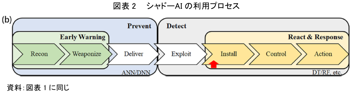 シャドーAIはこの理想形を根本から覆す。図表2が示すように、シャドーAIの利用は、従業員の行動そのものが、サイバー攻撃プロセスの一部と化してしまう危険性をはらんでいる。この図の赤い矢印は、「Detect(検知)」フェーズ内の「Install(インストール)」段階を指している。これは、組織の予防線をすり抜けた脅威がシステムに侵入する段階で、従業員が会社で承認されていないシャドーAIを「インストール」する行為が、意図せずして攻撃者に侵入口を提供してしまうことを象徴している。データフローはブラックボックス化し、従業員が良かれと思って行った業務効率化が、結果的に組織の防御壁に穴を開けるという、皮肉な現実を招くのである。