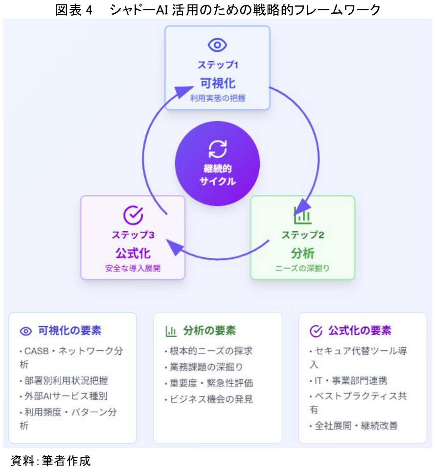 シャドーAIのリスクを適切に管理しつつ、組織の競争優位性の源泉へと昇華させるためには、経営層の視点転換と具体的な戦略が不可欠である。本章では、そのための戦略的フレームワークを「可視化」「分析」「公式化」という3つのステップで提言する。