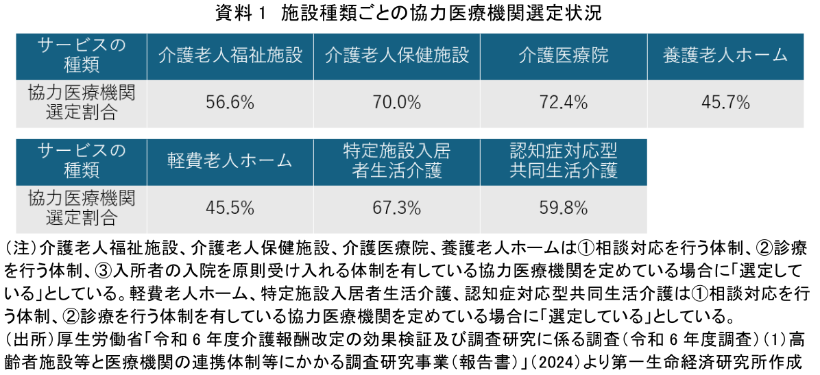 2024年、厚生労働省は高齢者向け施設の協力医療機関選定状況を調査している(資料1)。高齢者向け施設における上記①②③の要件などを満たす協力医療機関の選定割合は介護老人福祉施設で56.6%、介護老人保健施設で70.0%、介護医療院で72.4%などとなっており、選定の義務化が決まる中、選定が必ずしも進んでいる状況とまではいえない。